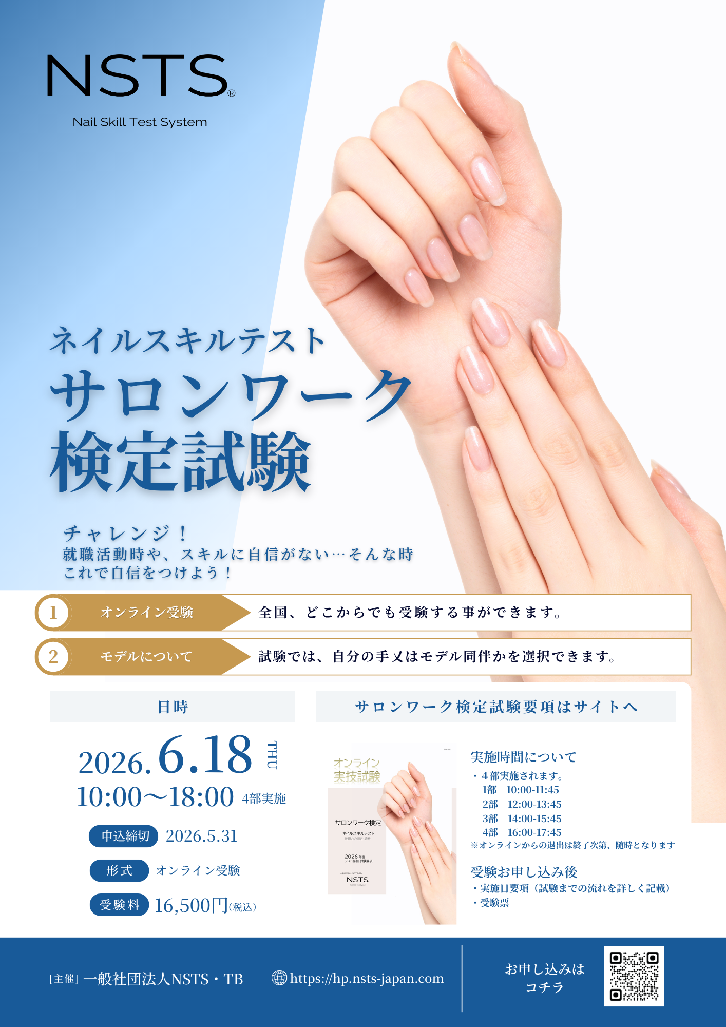 ネイルスキルテスト サロンワーク検定試験 就職活動時や、スキルに自信がない…そんな時 これで自信をつけよう! オンライン受験:全国、どこからでも受験する事ができます。 モデルについて:試験では、自分の手又はモデル同伴かを選択できます。 実施日2026.6.18 申込締切2026.5.31 形式:オンライン 受験料:16,500円税込 ・4部実施されます。 1部 10:00-11:45 2部 12:00-13:45 3部 14:00-15:45 4部 16:00-17:45 ※オンラインからの退出は終了次第、随時となります。 |